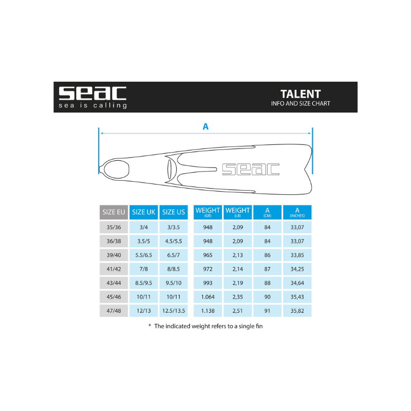 Die Seac Talent sind die Spezialflossen mit reduzierter Blattlänge, die für das Schwimmen in flachem Wasser und für alle Taucher, die in Gewässern mit stärkerer Strömung tauchen, entwickelt wurden. Tatsächlich sind die Seac Talent Flossen 13 cm kürzer als die Seac Langflossen Shout. Dies ermöglicht eine größere Beweglichkeit in flachen Gewässern, in Ufernähe oder an Felsen. Erfahrene Taucher schätzen die Seac Talent Flossen auch für ihren Vortrieb und ihre Reaktionsfähigkeit bei Strömungstauchgängen. Sie sind in 6 Größen erhältlich: 36/38, 39/40, 41/42, 43/44, 45/46, 47/48. Das geschlossene Fußteil der Seac Talent ist bereits für die Verwendung von 2,5 mm Neoprenstiefeln ausgelegt; wenn Sie Neoprensocken dieser Dicke verwenden, ist es daher ratsam, die Schuhgröße zu kaufen, die normalerweise täglich getragen wird.