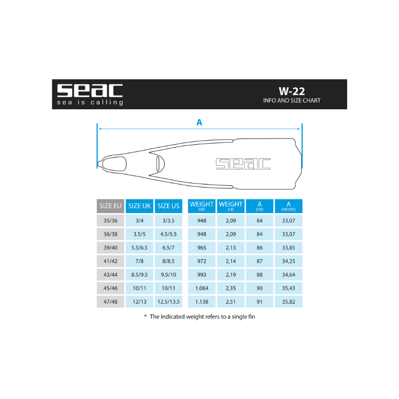 – Die Geometrie der W-22-Flosse: Das Blatt der SEAC W-22-Flossen ist um 22° geneigt. Dieser Winkel erleichtert den Flossenschlag, da er der natürlichen Neigung des Fußgelenks entgegenkommt. Kleine Stabilisierungsflaps, die am Ende des Flossenblatts an der Stelle der größten Wasserströmung angebracht sind, verhindern ein seitliches Abdriften der Flosse, ohne den korrekten Flex des Technopolymers des Flossenblatts zu beeinträchtigen.