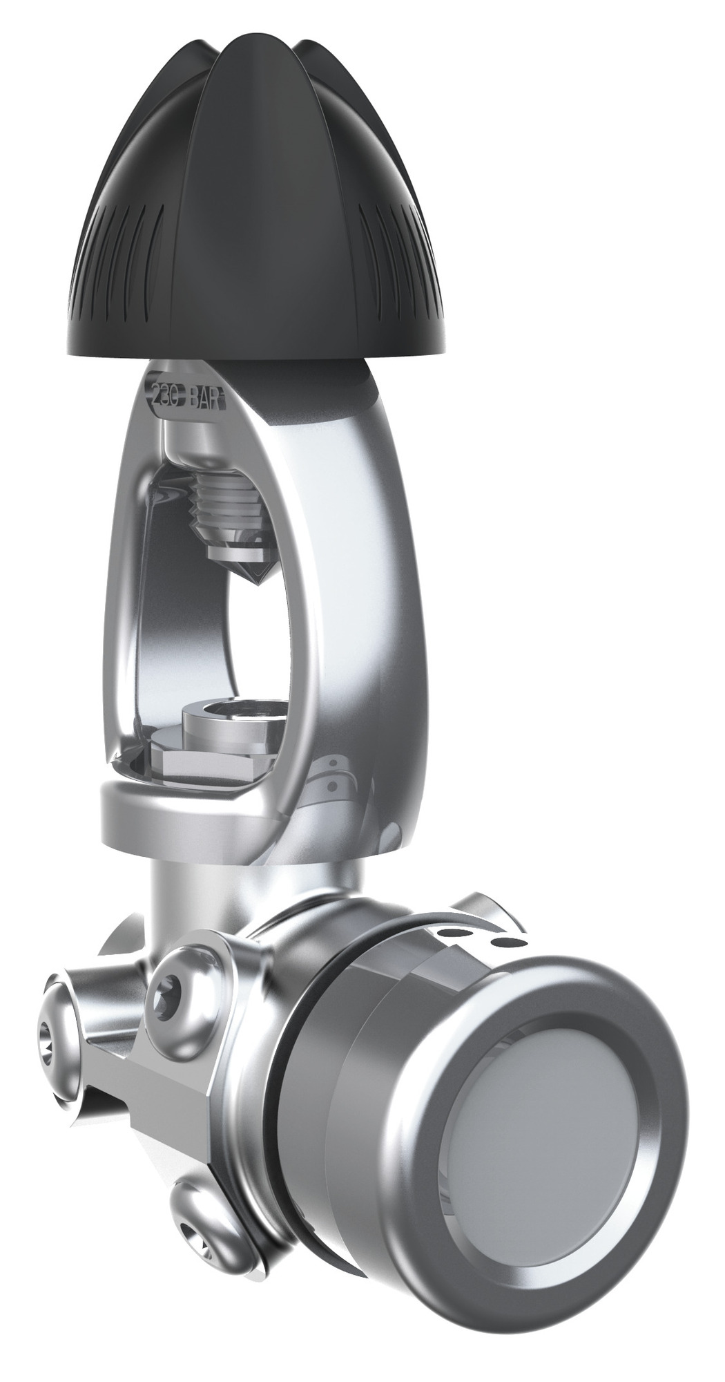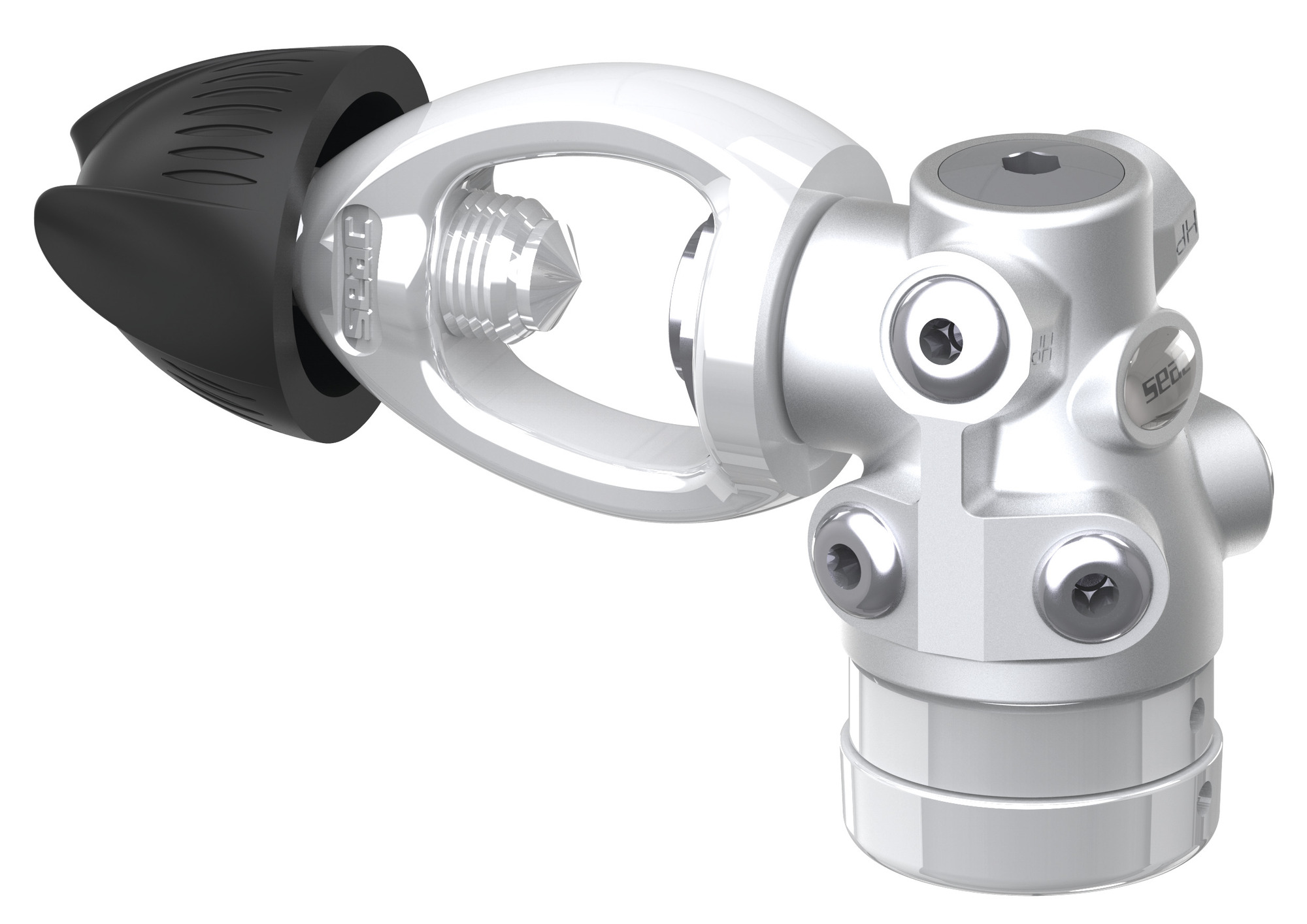- Die erste Stufe ist warmgeschmiedet und wird mit Hilfe von computergesteuerten Bearbeitungszentren bearbeitet, um ihr Gewicht so weit wie möglich zu reduzieren. Alle Ausgänge, sowohl HD als auch MD, sind ergonomisch für alle daran angeschlossenen Komponenten ausgerichtet: zweite Stufe, Oktopus, Manometer, Inflatorschlauch, MD-Schlauch des Trockentauchanzugs und HD für Sender, was verschiedene Konfigurationen ermöglicht.