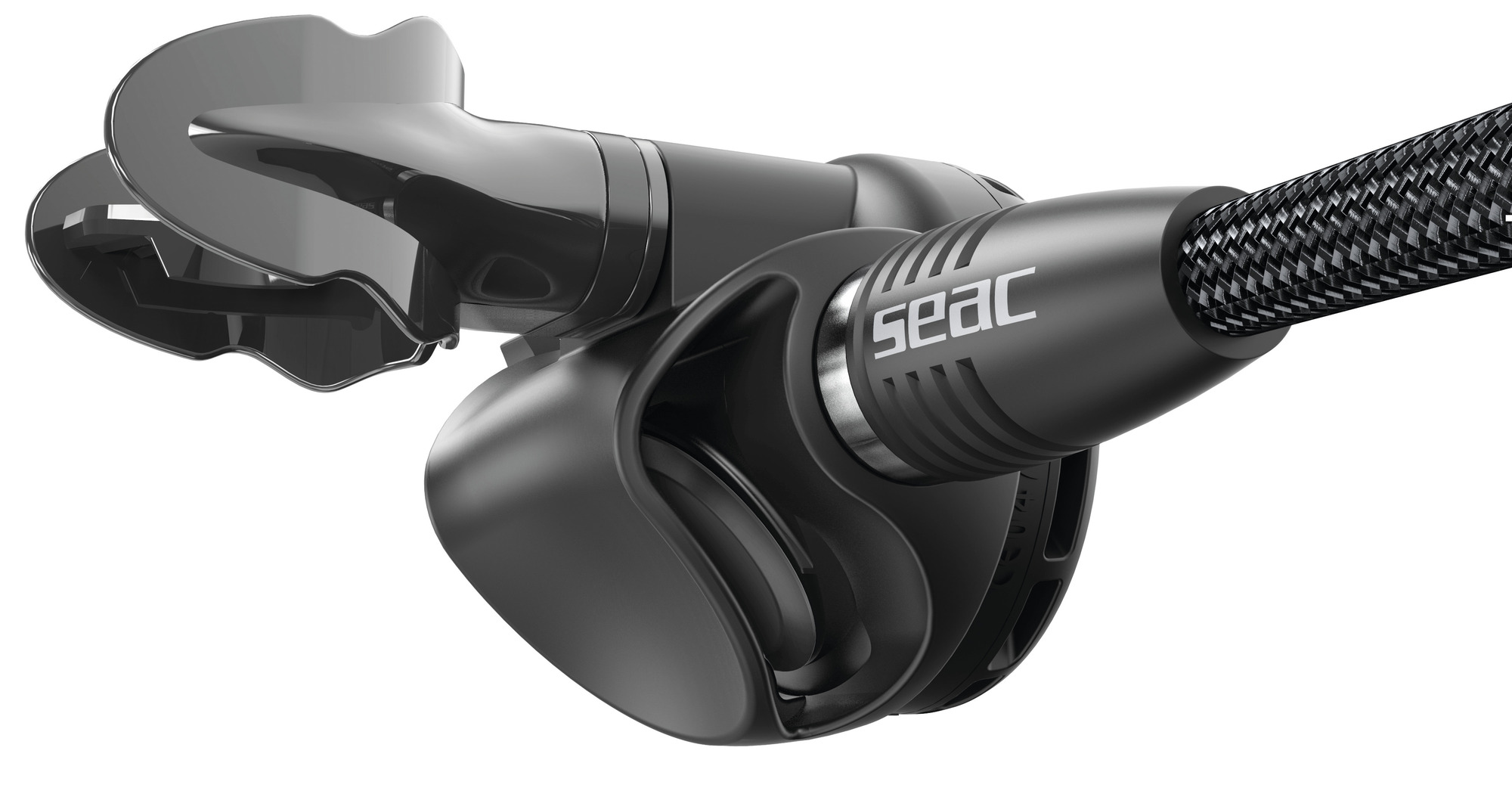 - Die großzügige Luftdusche aus weichem PU in zwei Materialien, die das SEAC-Logo hervorhebt, ist integraler Bestandteil der mit einem Stahlring versehenen Frontblende. Er optimiert sowohl die Bedienung – auch mit dicken Handschuhen – als auch den Wasserdurchfluss und reduziert so auch Atemarbeit. Durch die vorderen und seitlichen Öffnungen wird der Druck auf die Membrane umgelenkt und verteilt, wodurch das Risiko des Abblasens auch bei starker Strömung minimiert wird.