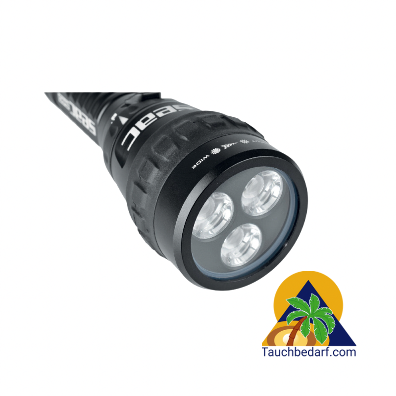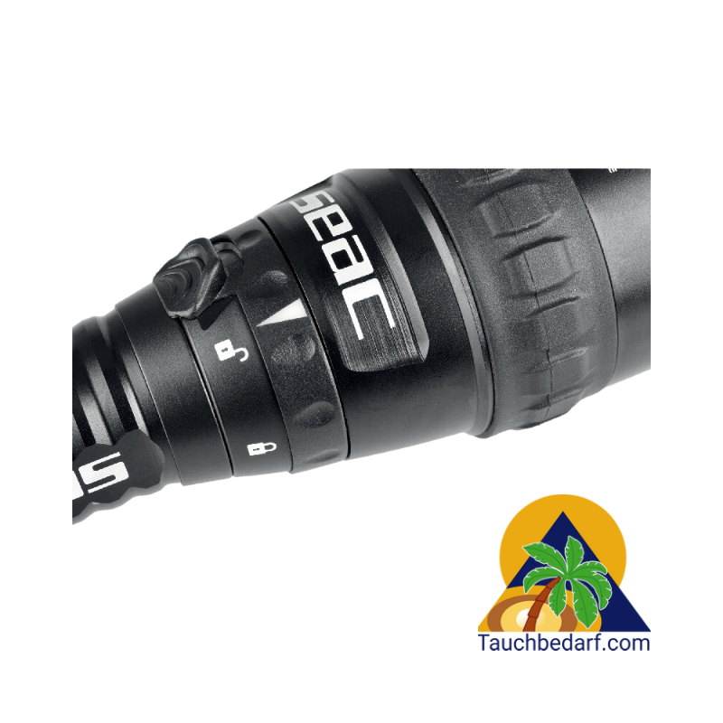 - Schalter: Electromagnetisches System. Modi: Max Power, reduzierte Power, Blitzlicht. Maximale Einsatztiefe: 100 m. Lichtintensität: 2300 Lumens.